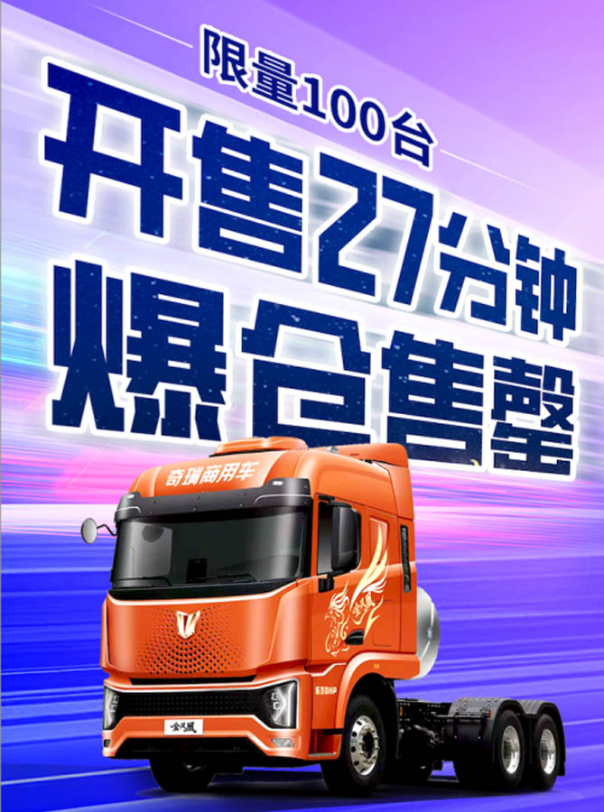 2025年5月28日,奇瑞商用车以一场火爆的线上抢购活动,再次证明了其产品在市场中的强劲号召力。在备受瞩目的奇瑞商用车战略级新品金凤凰燃气重卡正式面向市场之际,同步开启的线上抢购通道,仅用时短短90分钟,首批100台新车便宣告售罄。这一惊人的“奇瑞速度”,不仅是用户对产品价值高度认可的直接体现,更彰显了奇瑞商用车“定义重卡价值新标准”的强大市场底气。