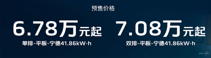风景T7单排平板预售价格为6.78万元起,双排平板车型7.08万元起,8月31日前下定,可享权益价值2万元的四重豪礼。第一重预定礼:999元定金抵3000元现金;第二重金融置换礼:置换至高补贴3000元或享受价值3000元的24期定额免息;第三重质保礼:首任车主动力电池终身质保;第四重权益礼:首任车主送价值5000元的首年全包服务+黑卡会员。