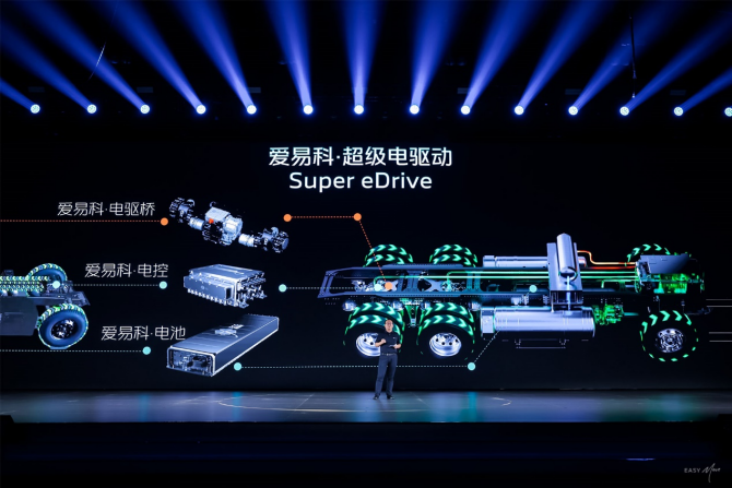 此次发布的爱易科超级电驱动,集超级安全、超级节能、超级智能于一体,全面匹配重卡、客车2类平台产品,可电可氢、涵盖电控、电驱桥、电池三大系统,以全技术领跑、全场景产品矩阵、生态服务创新引领新能源商用车新标准。