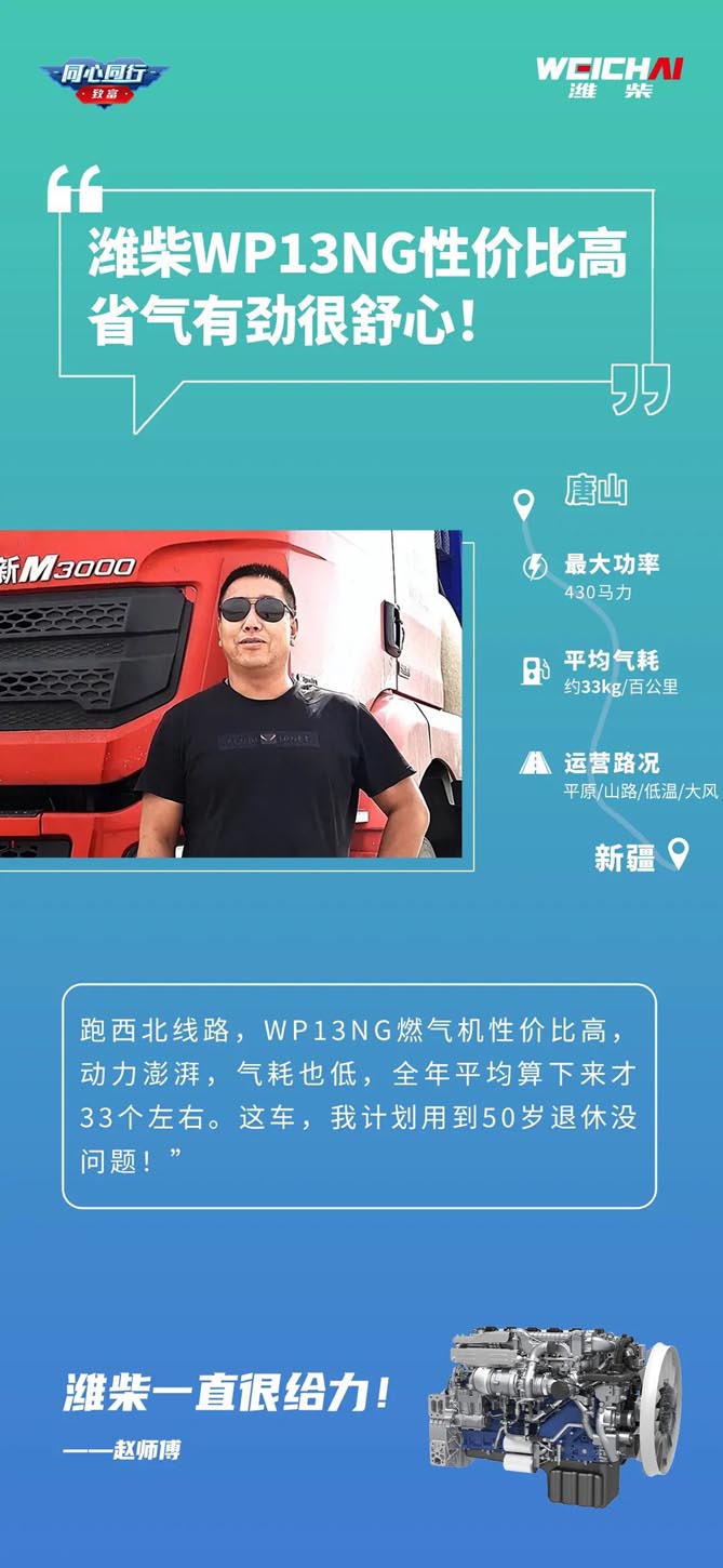 “我是2001年拿到驾照,那时候的潍柴发动机就已经在我们唐山特别受欢迎了。”赵师傅说,从唐山到新疆一路西行,开上几个小时,海拔就逐渐增高,连续走山路、上大坡更是家常便饭。“别看我的这款车是燃气机,但很有劲,满载上大坡啥的一点问题也没有。我运输的物资,货主基本都有时效要求,但这么多年下来,潍柴发动机从没有耽搁过我的路程,很舒心。”