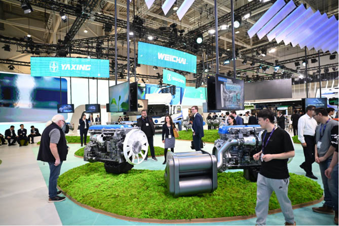 展会现场,潍柴带来了满足欧Ⅶ排放标准的53%高热效率柴油机、WP14T混动总成、WP15灵活燃料内燃机平台、300kW氢燃料电池动力系统等覆盖多技术路线的硬核产品,潍柴在传统动力和新能源动力领域的硬核实力惊艳全球。
