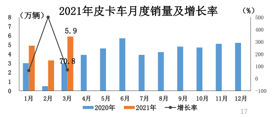 在众多涨声中,皮卡跑出了彩头。数据中,3月皮卡销量达到5.9万辆,远超2月销量。1-3月,皮卡产销分别完成14.0万辆和14.1万辆,同比分别增长1.1倍和1倍,实现销量翻番,远高于商用车和货车市场的平均水平。