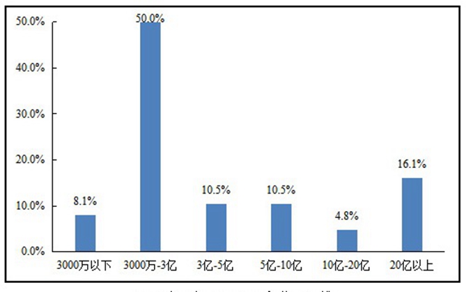 调查显示,2020年一半的被调查企业收入规模集中在3000万-3亿元之间,占比50%;收入规模3-10亿的 占比21%,10亿以上的占20.9%,还有8.1%的企业收入在3000万以下(如图3所示)。
