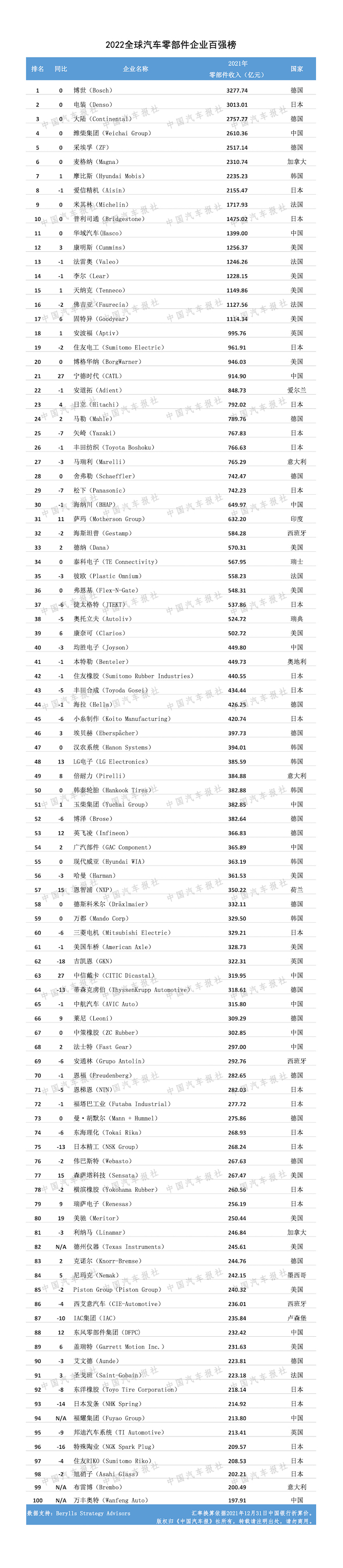 附:《2022中国汽车零部件企业百强榜》及《2022全球汽车零部件企业百强榜》