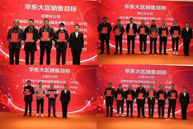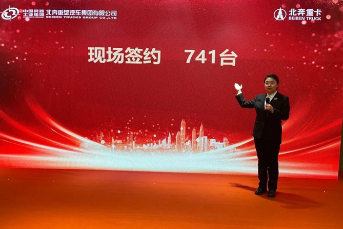商务晚宴期间,冯艳萍宣读《北奔重汽2023年度华东大区商务年会现场签单政策》,经销商踊跃参与,实现现场签约741台!