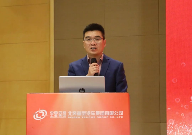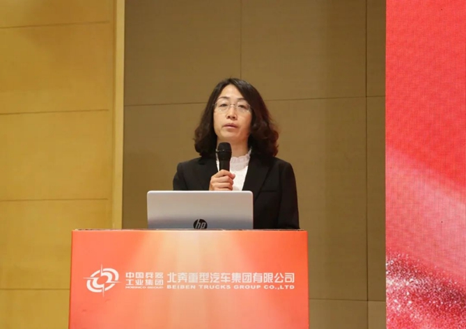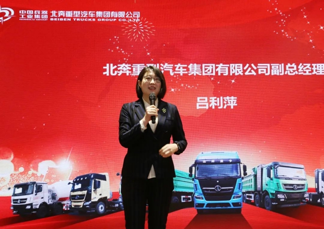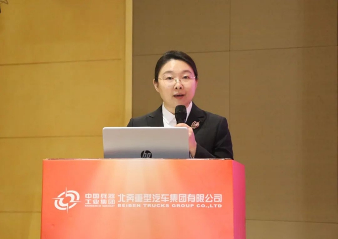 吕利萍以《共识北奔品牌 共建价值体系》为主题报告,讲述了北奔的故事。报告指出,北奔重汽始终坚持传承人民兵工的红色基因,秉承奔驰技术的蓝色血液,承载绿色发展的核心使命。北奔重汽出生伟大,使命光荣,先后四次参加阅兵,七次参与神州系列飞船搜索任务,彰显实力担当。四次作为国家代表,参加国际军事比武项目,斩获多项荣誉。北奔重汽作为国内从生产线到工艺、到技术图纸全套德国基因的研产销一体化发展的重卡制造企业。近年来积极践行国家双碳战略,坚持“政府培育、政策支撑,市场主导,产品支撑,场景先行,产业链协同,低碳绿色、包您满意”的工作方针,打造“绿色低碳物流运输方案解决商”。作为行业首家集成新能源重卡生态链、产业链、供应链、金融链企业,成为地方推动国家双碳战略的绿色发展主角、绿色运输主力、绿色产业链长。2023年,希望与各方合作伙伴携手共进,相互扶持,创赢未来。