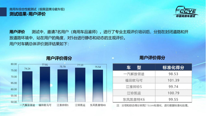 测试结束后,主办方根据测试数据,按照燃油经济性、驾乘舒适性、行驶动力性、制动性能、操控性能、降温及保温性能及用户评价七个维度计算出五款车型的测试得分。陈志强介绍说,本次测试活动从前期策划到测试全过程均立足于从消费者角度展开,各项指标结果,通过Z-score方式进行标准化处理,最终生成标准化得分,以便于物流用户进行参考。