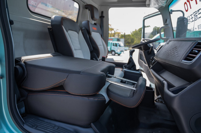 为了让卡友在跑货运的途中能够更好地休息,奥铃Pro对座椅做了放平的设计。然而“座椅放平涉及一个非常重要的地方,想要放平的话,肯定会丧失包裹感、舒适度。但内饰设计部门的要求是既不能降低舒适度,还要实现放平功能。为了解决这个问题,我们讨论了很多方案,先是从理论上分析可能性,再去做硬件,不停地验证,不停地推翻重来。那段时间,几乎所有人脑子里都在想这个问题,用了好几个月才解决。”内饰附件业务经理郝荣伟特别介绍了奥铃Pro座椅的研发思路和过程。“这次我们把产品设计思路往下延伸,比如说重卡上采用的气囊矫正座椅,我们把他移植到了奥铃Pro上。座椅内的海绵泡沫结合使用了多种硬度材料,乘坐时人体的压力分布更合理,也让座椅的包裹感大大提高。”