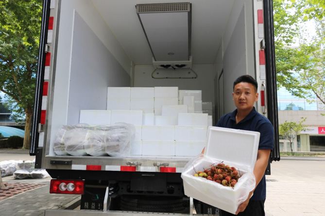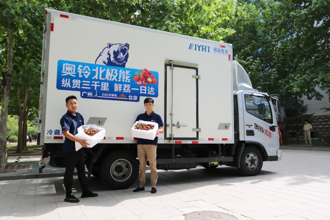 一天前,这批南方盛产的水果,还高挂在广州从化的荔枝树上。现场采摘之后,经过预冷处理,两位司机师傅将这批荔枝装入已调整好冷机温度的奥铃北极熊冷藏车上,车轮不停,从广州从化、经湖北武汉、到河南郑州、入河北,历经3000公里,最后到达北京福田奥铃总部。