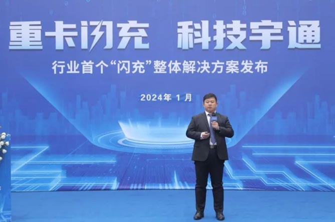 为最大程度给客户赋能,宇通重卡率先打响了行业“闪充”第一枪。2024年1月17日,在企业相关领导、用户代表以及行业媒体、线上观众的共同见证下,宇通重卡在郑州发布了行业首个“闪充”整体解决方案。