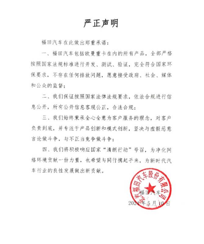 正本清源,福田汽车发布严正声明