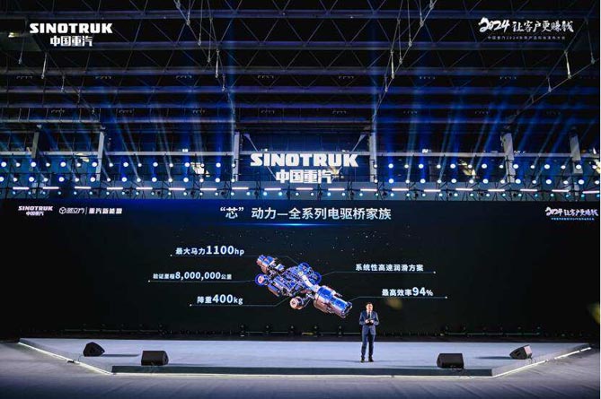 依托研发、供应链、制造工艺等核心优势,中国重汽成功研发行业独家双挡电驱桥技术,本次大会展出的3吨/5吨/6吨/12吨/16吨电驱桥,采用双电机两挡平行轴构型,高速永磁同步电机,最大输出功率400kW,超优布局电池不后背,拥有强动力、强承载、长续航、高通过性等优势,可满足轻卡、高速牵引车、场内牵引车、环卫车等新能源车辆运营场景需求。