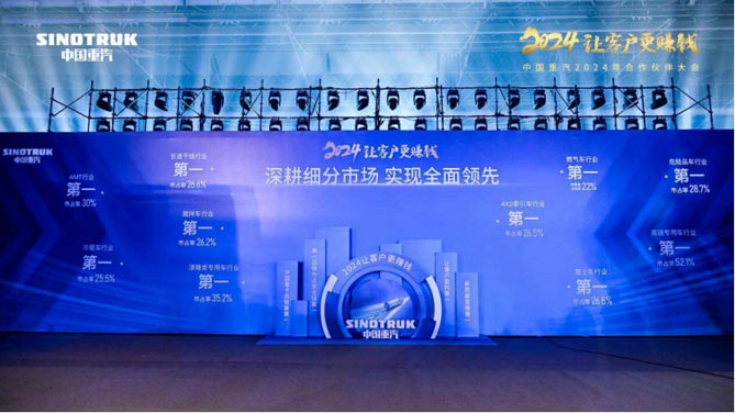 依托卓越产品力,中国重汽在各细分市场取得多个行业第一:中长途干线市场市占率26.6%,行业第一;搅拌车市场占有率26.2%,行业第一;冷藏车市场占有率25.5%,行业第一;AMT市场占有率30%,行业第一;清障类专用车市场占有率35.2%,行业第一;燃气车市场四季度占有率22%,行业第一;危险品车市场占有率28.7%,行业第一;高端专用车市场占有率52.1%,行业第一;渣土车市场占有率26.8%,行业第一;4×2牵引车市场占有率26.5%,行业第一。