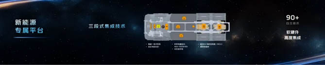欧曼银河9是油气氢电混多技术路线,其专属的新能源平台,采用创新的三段式集成技术,拥有超过90项自主技术,实现高效轻量化电驱桥、全域高效碳化硅控制模块、多种电量组合和兆瓦级充电技术、智能一体化热泵技术、自主8合1电控技术等软硬件高度集成。