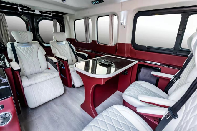 让旅途更具品质感,V90墨采用国内宽体轻客中首款原厂开发的电动侧移门,车内高度近1.8m,进入车内用户不用弯腰也可行动自如。不止于此,V90墨搭载VIP独立座椅,支持座椅加热及通风,靠背、腿托还可电动调节,辅以空气悬架,为用户提供媲美“头等舱”的舒适享受。