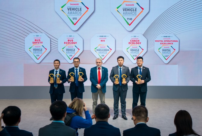 在这场盛会上,中国客车品牌宇通以“Think Eco,Move Green”为主题,携高端纯电动车型及多项前沿技术亮相,并一举斩获“年度最佳客车大奖”、“年度最佳巴士大奖”等七项Busworld大奖,创下迄今中国客车品牌参评Busworld获奖数量的最高纪录。其中,年度最佳客车大奖和年度最佳巴士大奖,均为中国客车品牌在Busworld首次获得,再次为中国制造赢得荣光。