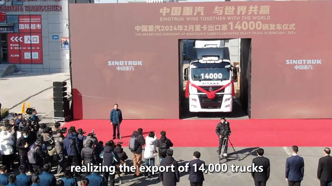 3月1日上午10:00,“中国重汽 与世界共赢” 2024年2月份出口14000辆重卡,在济南海关综合保税区隆重举行最后一批发车仪式。济南海关关长刘卫,山东重工集团董事长、中国重汽集团董事长谭旭光,中国出口信用保险公司山东分公司总经理魏广远,共同参加活动。 刘卫对中国重汽单月出口突破14000辆的成绩表示祝贺。他说,中国重汽已成为中国最大的重型商用车生产基地。济南海关将探索升级区港联动整车推广模式,进一步提高整车通关效率,支持中国重汽高质量走出去。 谭旭光说,中国重汽今年1月份、2月份出口连续突破1.3万辆、1.4万辆,利润增长高于收入增长,实现了真正的高质量发展。 刘卫、谭旭光共同为50辆中国重汽重卡发运出关。 济南高新区党工委副书记、管委会常务副主任任广锋,泉城海关关长杨炳文,济南综保区管委会副主任张军。中国重汽集团总部主管级以上干部,国际公司、海外各大区全体驻外人员线上线下共计700余人参加活动。