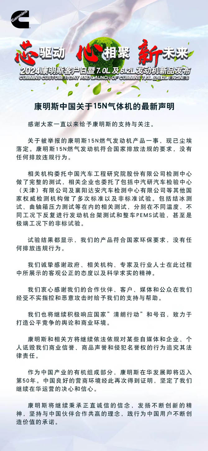 关于被举报的康明斯15N燃气发动机产品一事,在客户日上,康明斯中国也作出了回应和澄清: