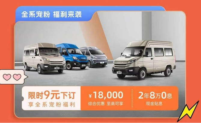 赶快行动起来吧,618期间,9元下订即可享受依维柯全系车型的宠粉福利!