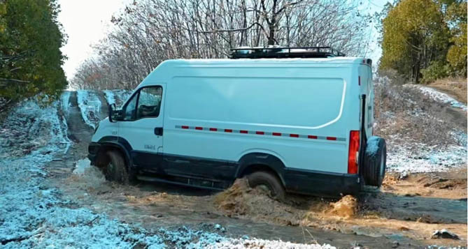 在野外地质勘探等使用场景中,当面对湿滑泥泞的沼泽和坑洼路面时,越野车行驶更看重车辆的整体驱动能力,此时全时四驱就显得尤为重要,在湿滑、泥泞等复杂路况下,像依维柯越野车这类装载了全时四驱系统的车辆,能够根据路况实时调整动力分配,确保四个车轮都能获得适量的动力输出,稳定的行驶状态,降低打滑和失控的风险。同时,在起步或加速过程中,全时四驱系统能够迅速响应驾驶者的操作意图,提供强劲的动力输出,让越野驾驶更加得心应手。