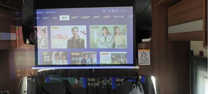 潇肖女士:“我这台房车是依维柯的底盘,内部空间很大,所以我就自己装了个投影仪在里面,想看什么就投什么,比电视好用,即使在户外也能享受到影院级的观影体验。”