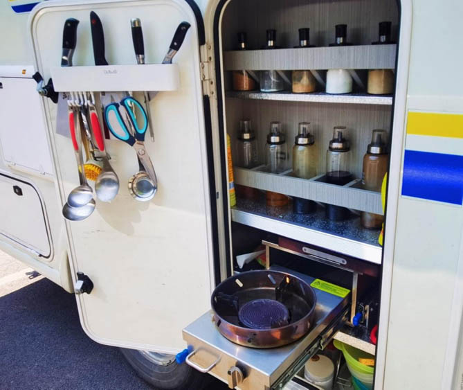 孙女士:“我平时很喜欢做饭,所以对厨房的布置比较多。房车的厨房设计合理,空间大,能放很多东西。而且,我这台车是依维柯底盘配空气悬架的,车子的超高稳定性让烹饪过程更加平稳,即使是在颠簸的旅途中也能安心制作美食。”