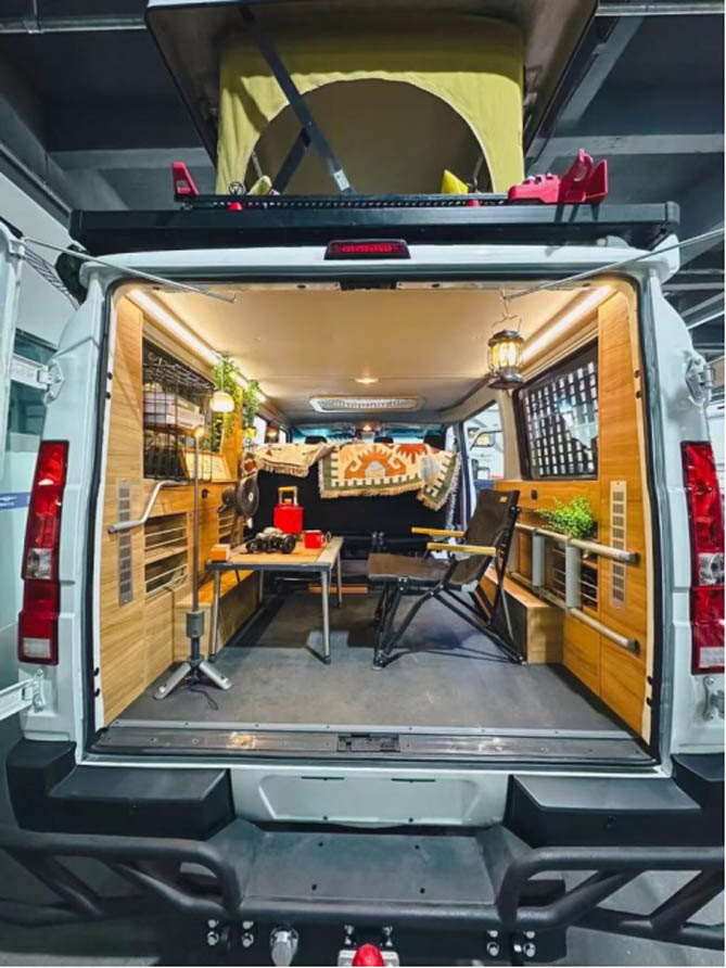 此外,得意宿营车还有着超强的DIY属性,从战术箱、行李架射灯到遮阳篷,再到车身外挂板,等等,而且其车内空间可以任意打造,无论是文艺风,还是户外风,用户都可以根据自己的需求进行改造,打造出一辆属于自己的独一无二的宿营车。