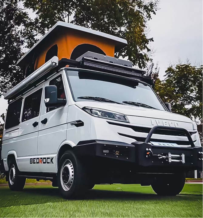 基于依维柯得意自动挡A35平台打造的宿营车,具有高通过性、短途住宿、DIY创造、应急救援、旅游租赁等多功能用途,是真正的百变搭档;其造型硬朗,还提供了钢灰、沙漠黄、荧光绿三种颜色选择,满足了用户多元化的审美需求。