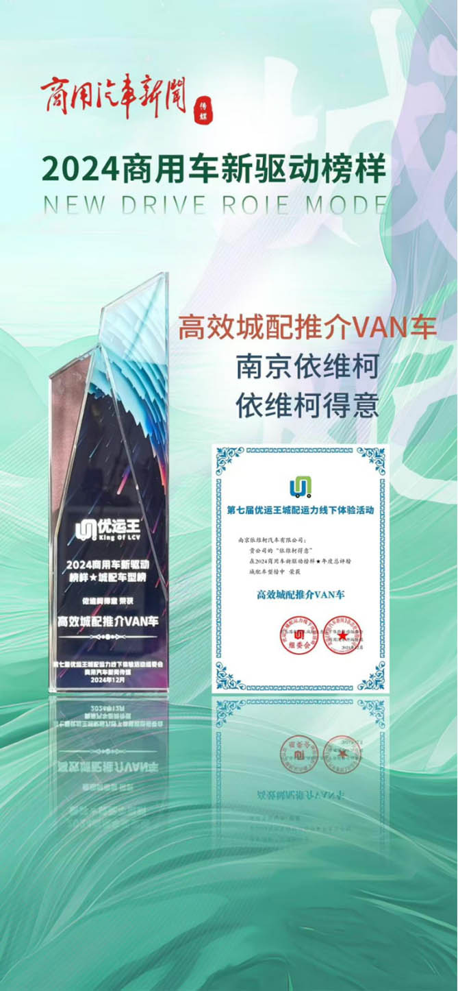 12月18日,由商用汽车新闻传媒主办的2024商用车新驱动榜样峰会在北京圆满举办。在颁奖典礼上,南京依维柯揽获两项大奖,可谓双喜临门。其中,依维柯得意荣获“高效城配推荐VAN车”奖;依维柯聚星荣获“智能客运先锋”奖!