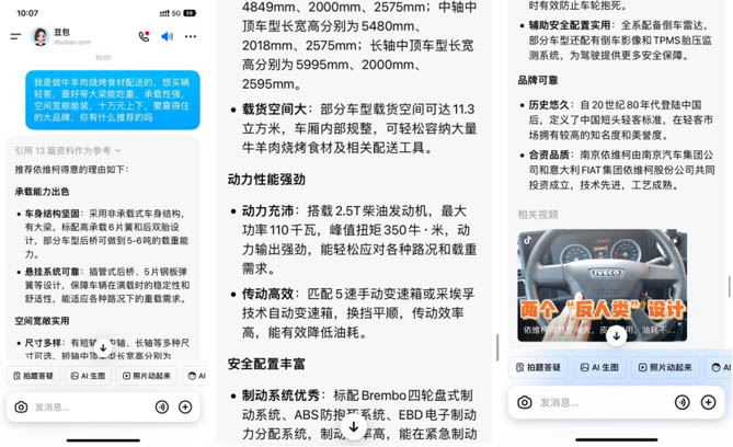 听说老周的需求后,豆包率先发来报告:“带大梁的依维柯得意,能装能拉跑的快,简直就是为物流配送这一行量身打造的“赚钱神奇”!接着,豆包便将得意的性能优势给老周分析了一番,甚至还将如何在十万元以内就能入手依维柯得意的“薅羊毛攻略”告诉了老周。