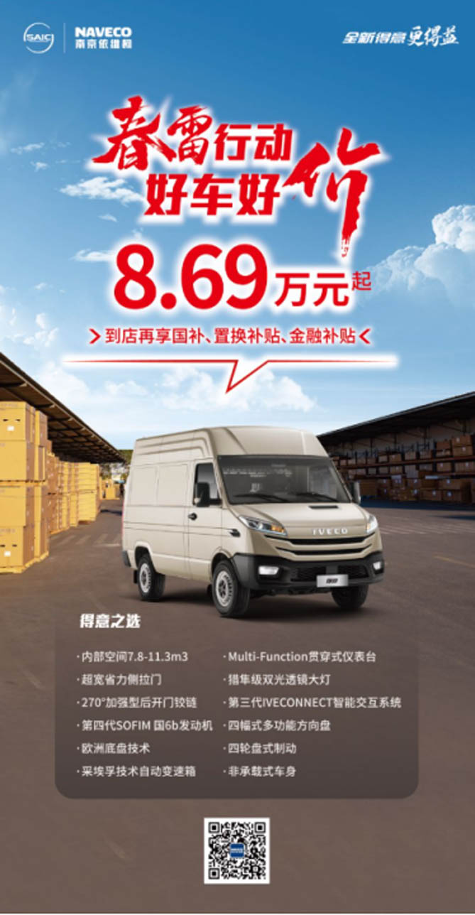豆包告诉老周,南京依维柯“春雷行动”中,用户购车可享受现金补贴、金融贴息、保险优惠以及至高20000元的国补,老周心仪的得意单胎车型只要8.69万元起!看见如此亲民的价格,老周不禁喜上眉梢!