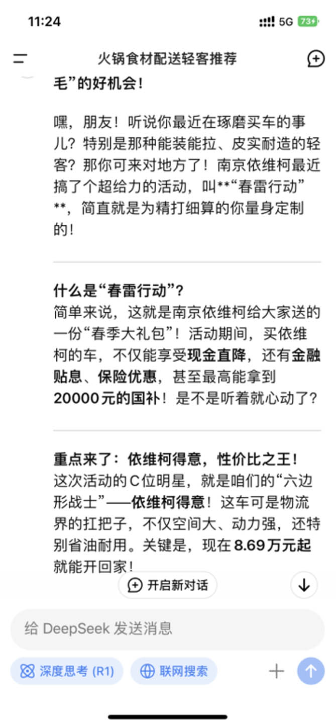 老周还是不放心,赶紧又问:“开车遇到红绿灯起步最怕后面车滴我了,得意的动力咋样啊?”他最在意的动力问题,在得意的产品参数里找到了答案。依维柯得意单胎车型搭载全新SOFIM第五代柴油发动机,动力强劲,功率可达110kW;并且它还是后驱车,在城区红绿灯前起步时,提速迅猛,1400-2800rpm转速区间,就能输出高达350N·m的最大扭矩,哪怕是城区低速重载的情况,得意也能轻松拉动!不仅如此,DeepSeek 同样贴心的为老周“出谋划策”,在南京依维柯 “春雷行动” 期间,探讨怎样花最少的钱,把心仪的依维柯得意这款车开回家 。