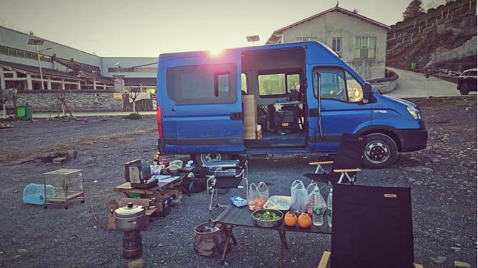 傍晚想休憩会,便找了块空地露营。把折叠桌椅支起来,从后备箱搬出卡式炉和锅碗瓢盆,直接在路边煮起了中午买的酸汤粉,香味飘出去老远。隔壁帐篷的大哥闻着味就过来了,看见我从后备箱搬出整套厨房用具,直感叹:“兄弟,依维柯是真能装啊!我们家后备箱塞得满满当当,啥都不敢多带,哪像你还能搞个移动厨房!”我笑着说:“我们家经常出去露营,有经验了,专门买的这种空间大能改装的车,出门在外图个方便省事!”
