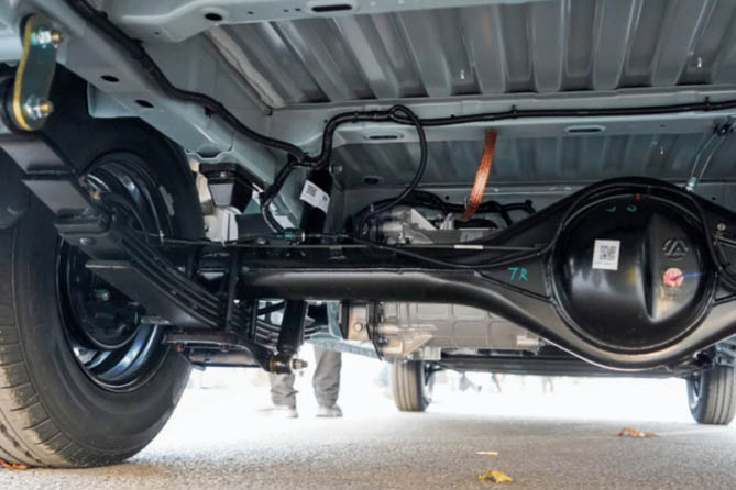 那就不得不提起东风睿立达渐变簧设计,为了保证用户空/满载的舒适性,东风睿立达特意在板簧上留有缝隙。在空载时,通过板簧设计出刚度小的结构,仅三片板簧参与工作,降低刚度,提升行驶平顺性,避免传统板簧空载过硬的问题。而在满载时,设计使板簧逐步贴合,刚度增强,承载力大幅提升,确保重载运输的稳定性。通过渐变式的板簧结构设计,完全实现了用户日常使用和拉货的平衡,真正做到运输、舒适两相宜。