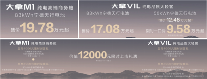 其中,纯电高端商务舱大拿M1,搭载83度宁德天行电池售价19.78万元起;纯电品质大轻客大拿V1L,83度宁德天行电池版售价17.08万元起;50度宁德天行电池版售价12.48万元起,限时一口价9.58万元起。新车上市之际,还带来价值12000元的丰厚限时上市礼遇。