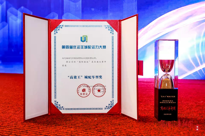 2021年10月15日第四届优运王城配运力大赛颁奖典礼在北京举行。历经装箱比赛、场地操控试驾比赛和场外实际路况测试等多重考验,奥铃速运从诸多参赛车型中脱颖而出,以优异的成绩一举夺得轻卡组“高效王”城配车型奖。