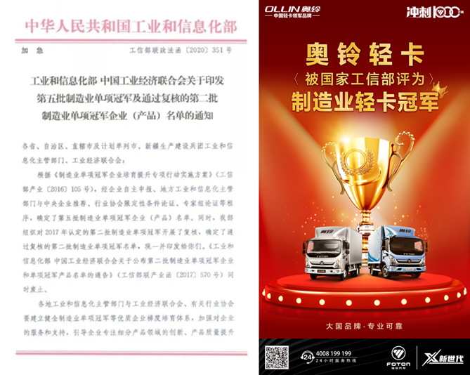 匠心精神出匠心品质。2020年,奥铃轻卡被国家工信部认定为 “制造业单项冠军产品”,同时实现了 “行业增速第一、两年销量翻一番、三年增长100亿”的好成绩,成为集制造业冠军和销量冠军于一身的双冠王。