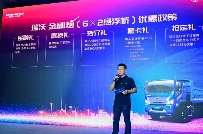 为了回馈各位卡友的信任和支持,福田瑞沃金刚炮(6x2悬浮桥)工程车在上市之际也强力推出了五重大礼,让用户购车养车一步到位。时代事业部 瑞沃营销公司副总经理王波详细解读了五重大礼,分别是:1、金融礼:低首付、0利息,最高可享12000元金融贴息;2、置换礼:置换购车厂家直补1000元;3、转介礼:福田e家转介购车赠送30000积分或最高享800元现金礼;4、黑卡礼:购车即送价值1880元黑卡一张(可享受20桶原厂尿素、200元维保优惠券、4次定保免工时费、4次智能点检、20公里内1次免收服务费);5、抢订礼:活动当日线下订车并在1个月内交车的客户享受1888元优惠。