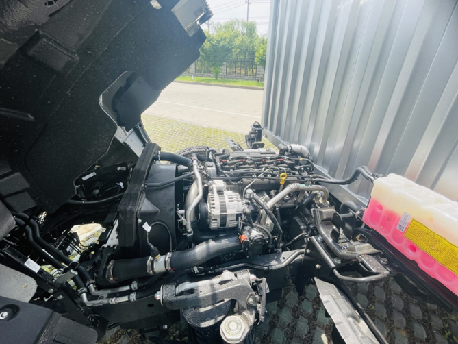 车架采用610高强钢车架,断面高170mm承载力强,宽度760mm稳定性好。车架用料和工艺都非常出色,用户无需担心。车架左侧布置的是100Ah蓄电池舱,右侧布置的是80L油箱和尿素箱。整体布局合理,坚固可靠,检修方便。