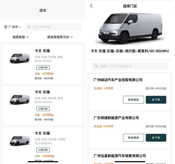 卡文e家支持选择城市、车型、租赁方式(经营性租赁和以租代售),为用户推荐车型、租赁方案及附件门店,让客户快速下单。租赁方案可定制,可租可售多种方案选择,降低购车门槛,增加收入来源。