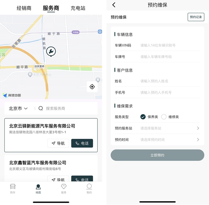 进店维保,可以通过地图查询附近的服务站,选择您心仪的门店一键导航进行维保。在线预约维保,用户只需轻点屏幕,即可一键预约,服务商可提前准备材料,协调维修工位,让客户享受透明高效的养车体验。此外,道路救援、24小时400客服、用户维保手册等功能,也寸步不离地为车主提供着全方位的用车保障。