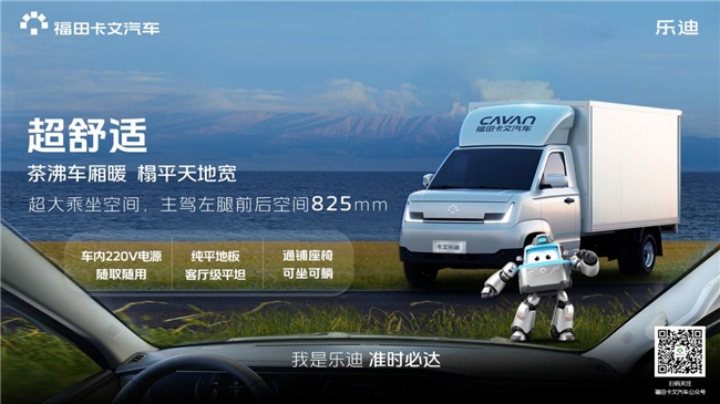 在日常高频使用场景中,卡文乐迪不仅关注运输效率,更关心驾驶者的安全、舒适体验。乘用车级的双连屏设计与怀挡布局,使操控更便捷,驾驶更安心;主副驾座椅可实现“平躺”模式,悦享宽敞舒适的驾乘及休憩空间;220V电源接口让多种设备随时取电;10处超38L的储物空间,布局合理的驾驶环境;186米超长照射距离的LED大灯,为夜间行车提供清晰视野,安全畅行;卡文乐迪既能满足用户的高效奔波,也能在繁忙间隙中带来舒适与便利。保证轻松驾驶的前提下,车也是温暖舒适移动的家。