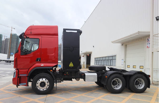 乘龙的轻量化技术在行业内有口皆碑,这款乘龙H5纯充电牵引车采用了35项先进的轻量化技术,自重轻至10.1吨,较同级产品轻500千克以上。同时,它拥有高达405kW的最大功率,配备6AMT变速箱,电耗低至每公里仅1.2kW·h,相较于油车每公里可节省1~2元,进一步提升了动力性和经济性。
