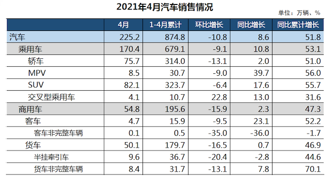 数据显示,4月,汽车产销分别完成223.4万辆和225.2万辆,环比分别下降9.3和10.8%,同比分别增长6.3和8.6%。1~4月,汽车产销分别完成858.6万辆和874.8万辆,同比分别增长53.4%和51.8%。