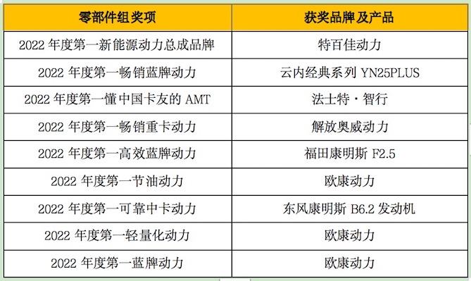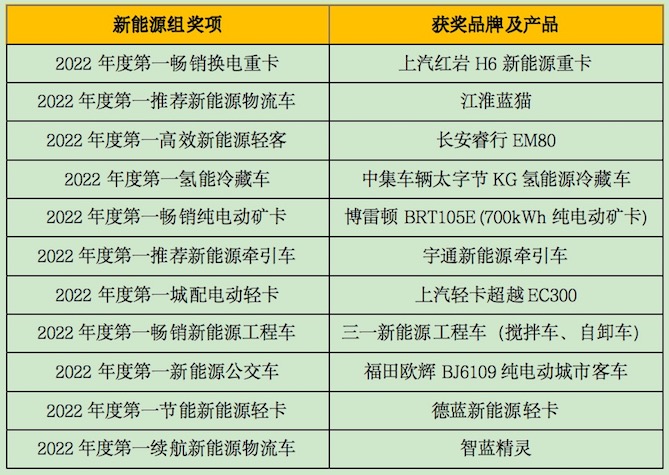 此外,为推动商用车行业加速向新能源方向发展,今年的新能源组评选设置了“2022年度第一畅销换电重卡”、“2022年度第一推荐新能源物流车”、“2022年度第一高效新能源轻客”、“2022年度第一节能新能源轻卡”、“2022年度第一畅销纯电动矿卡”、“2022年度第一氢能冷藏车”、“2022年度第一新能源公交车”和“2022年度第一续航新能源物流车”等奖项。在零部件领域,本次评选设置了“2022年度第一新能源动力总成品牌”、“2022年度第一懂中国卡友的AMT”、“2022年度第一畅销蓝牌动力”、“2022年度第一畅销重卡动力”、“2022年度第一可靠中卡动力”、“2022年度第一高效蓝牌动力”、“2022年度第一节油动力”、“2022年度第一轻量化动力”等重磅奖项。