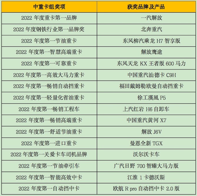 中重卡组奖项 获奖品牌及产品
