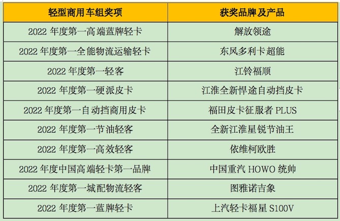 轻型商用车组获奖品牌及产品