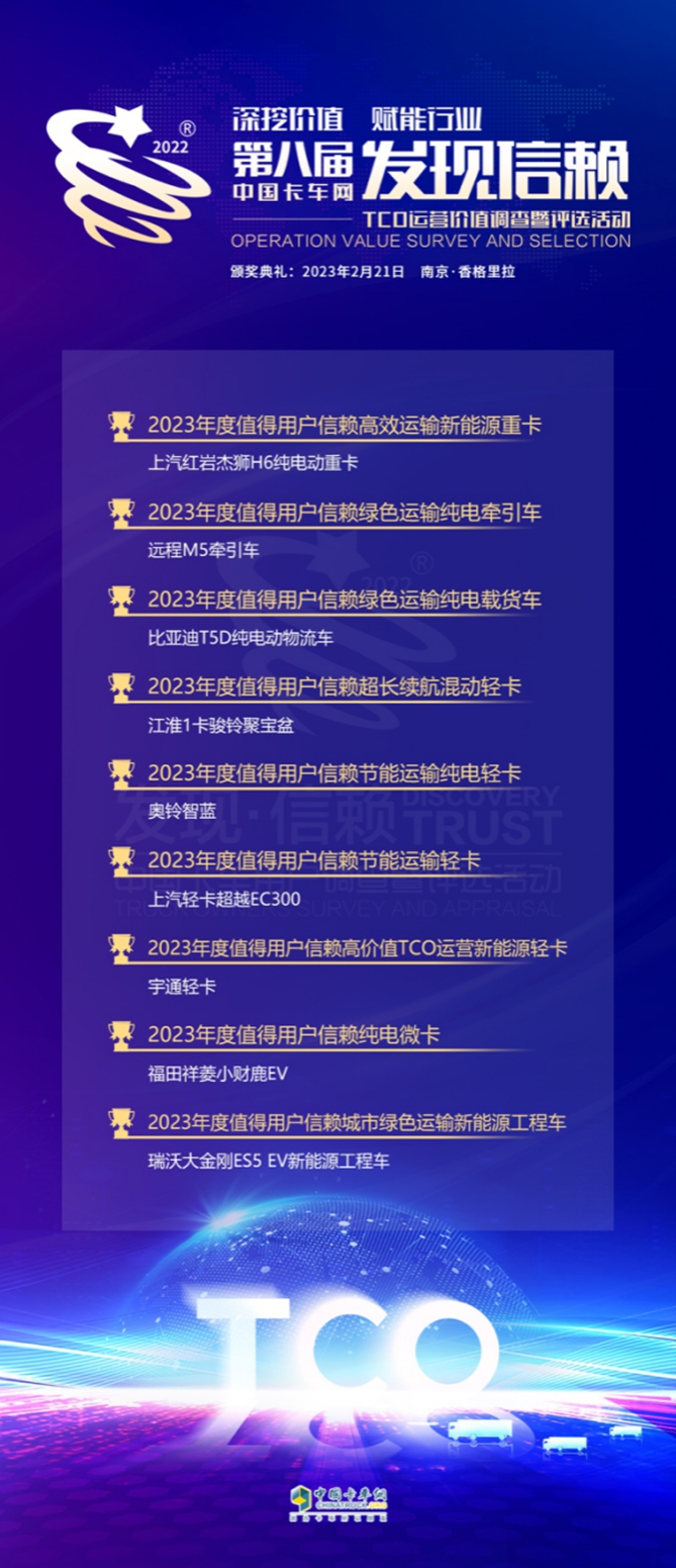 一个个值得信赖产品的评出,也点亮了2023年的卡车市场。在第八届发现信赖的颁奖典礼中,我们看到了卡车、零部件制造企业对产品的努力革新,也感受到了值得用户信赖产品为卡车企业、为物流运输行业带来的影响力。相信,有了这些信赖力量的注入,2023年卡车市场将会得到更大的鼓舞,得到更快的回暖,物流运输企业也将获得更多的运营价值。
