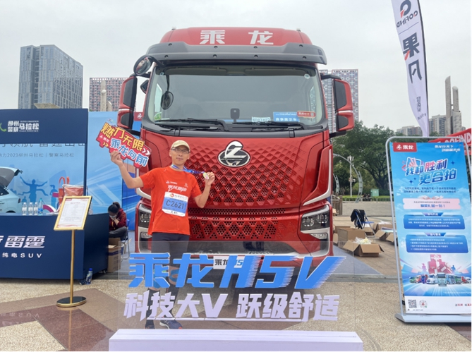 半马/全马的终点现场有乘龙H5V展示,乘龙H5V是东风柳汽乘龙全新一代智享卡车,具有“高颜值、高舒适、高科技、低油耗”四大优势。
