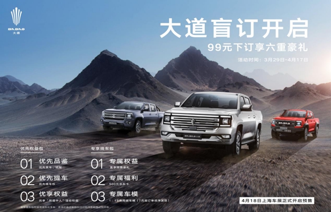 在本次品牌发布的同时,江铃大道还推出了巡天架构下的三款新车型——大道乘用版、大道商乘版和大道越野版。其中,大道乘用版和大道商乘版还开启了盲订活动。2023年3月29日至2023年4月17日,在江铃皮卡官网、江铃智行APP或联系当地经销商扫描大道官方盲订二维码,支付99元订金,即可尊享6重豪礼:包括优先品鉴、优先提车、优享“同道中人”活动权益在内的三大优先权益包,以及直享预售豪礼、500元京东卡、1:18大道乘用版精品车模(7月按订单顺序发放)在内的三大专享提车包。
